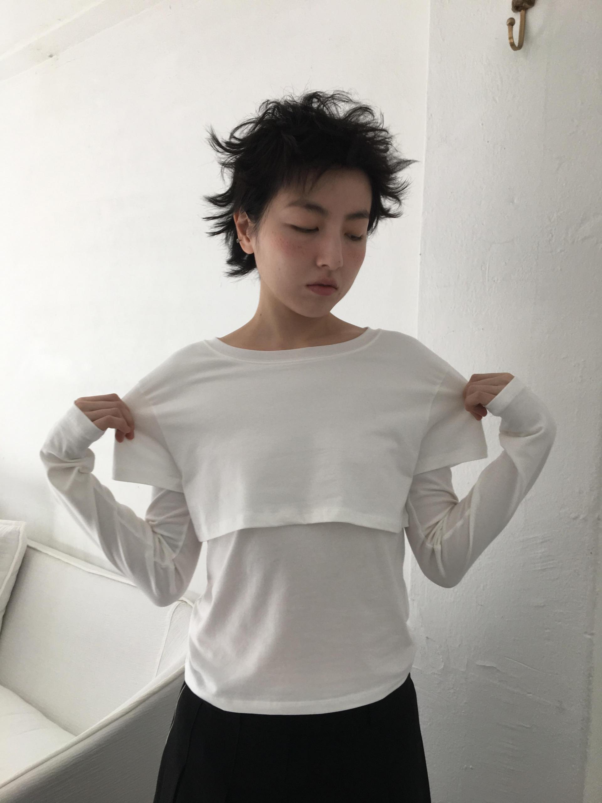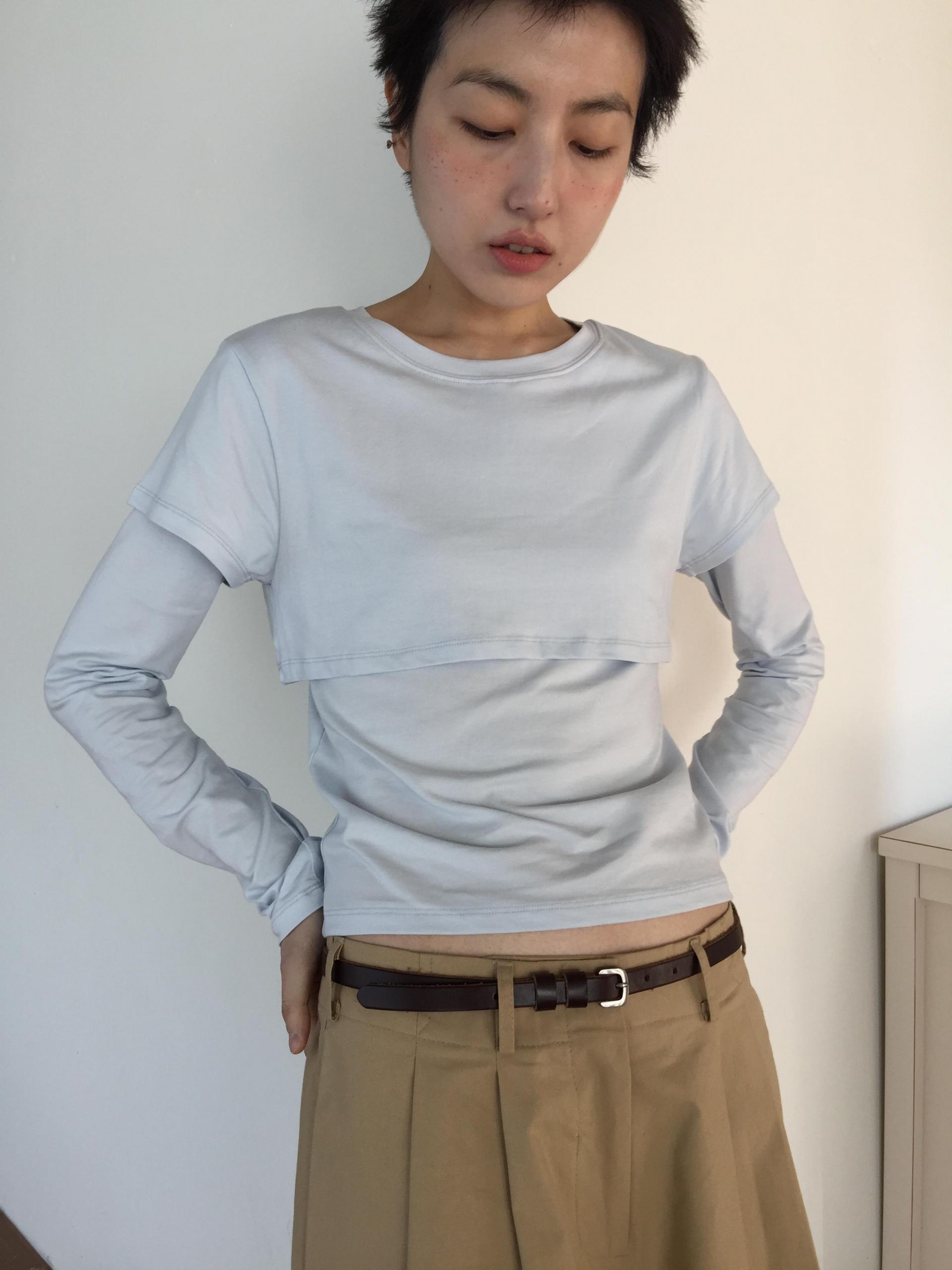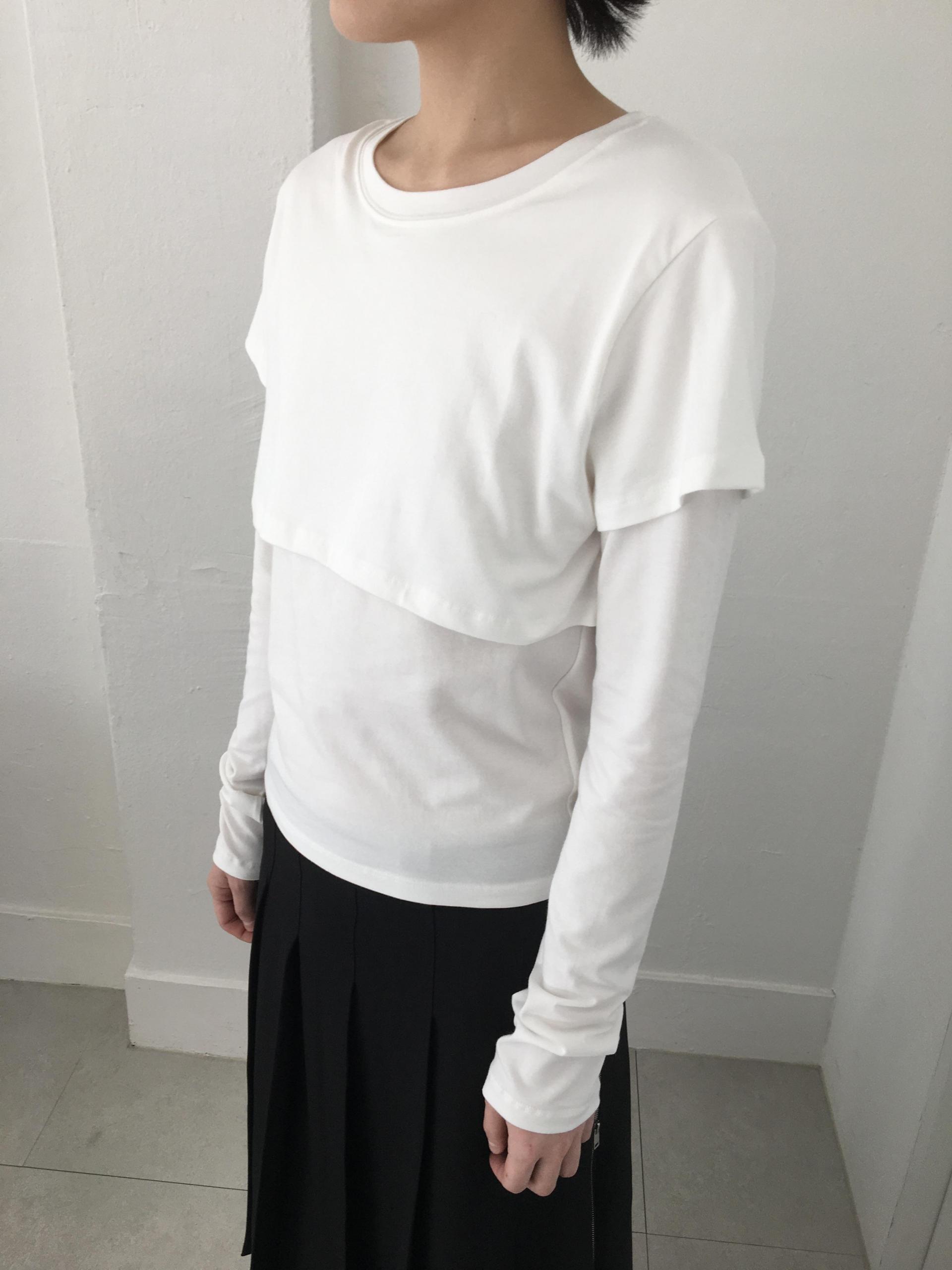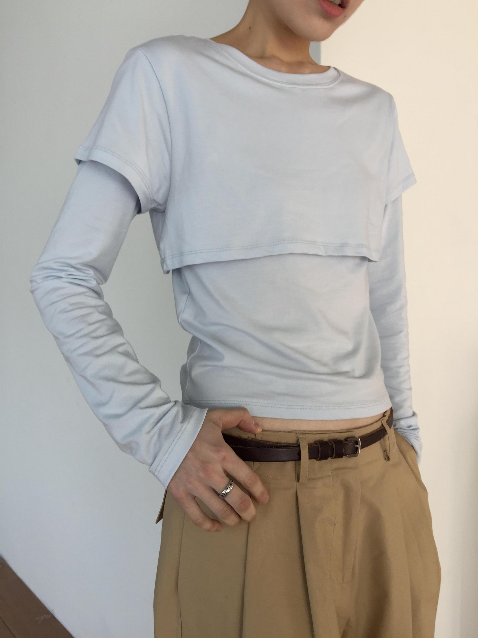 긴소매 기장과 반소매 기장이 합쳐져 레이어드한 것 처럼 연출되는 티셔츠