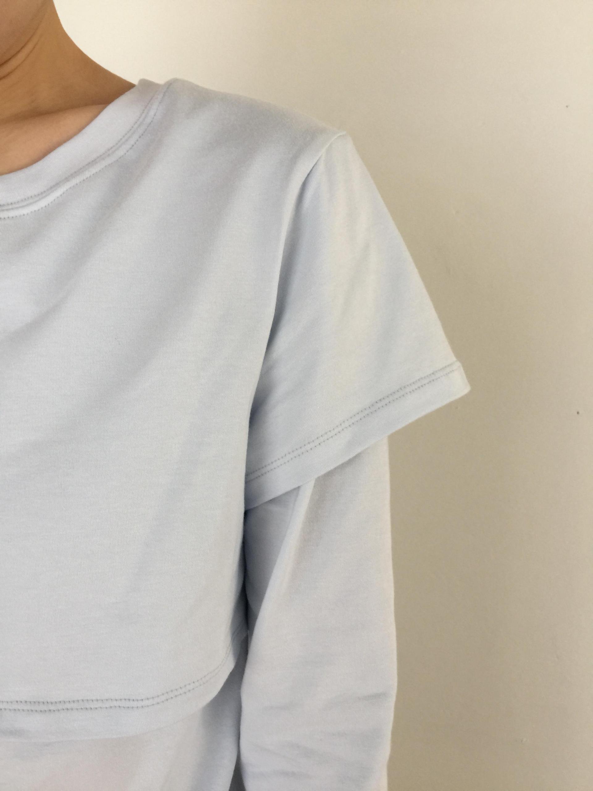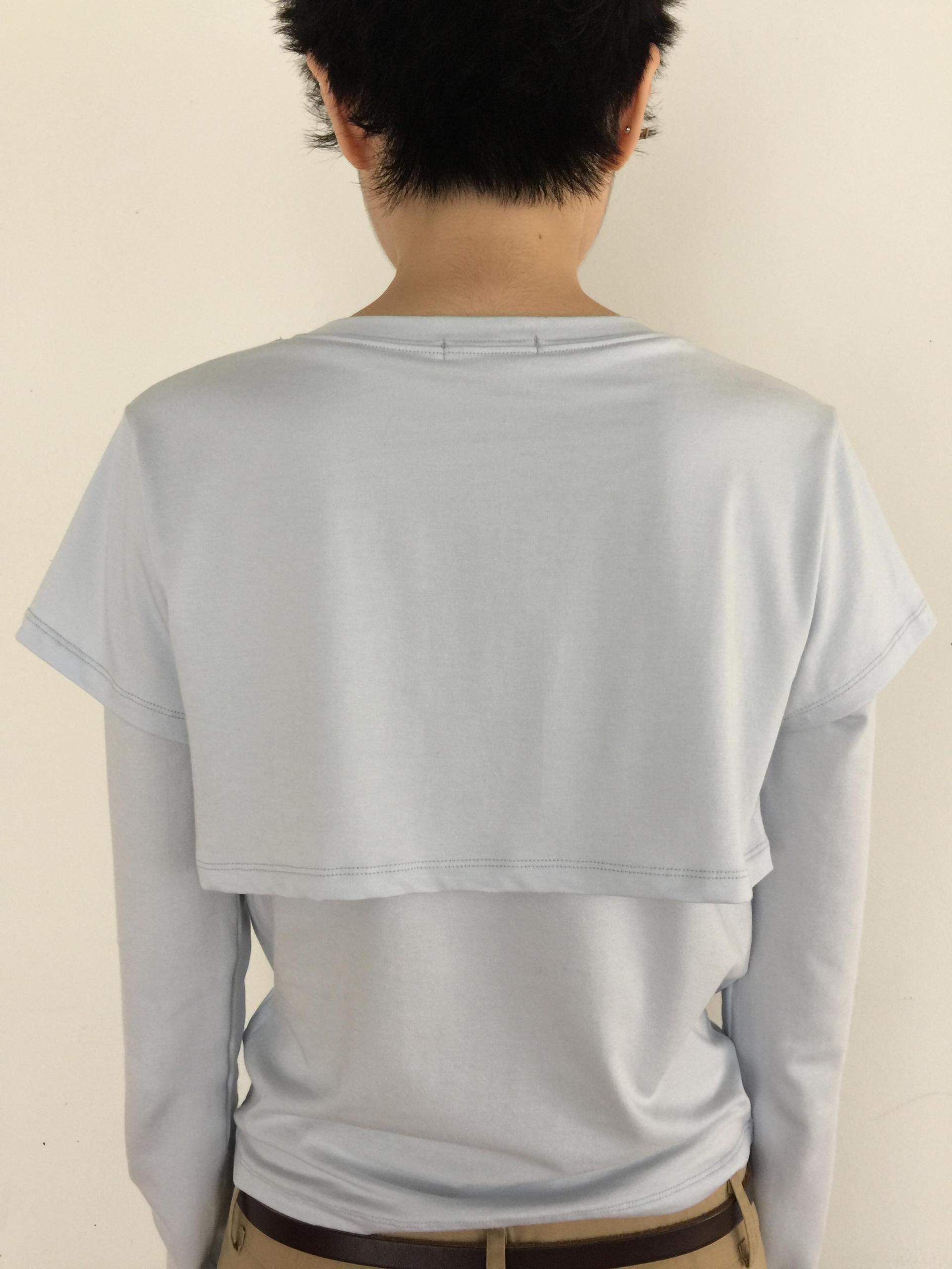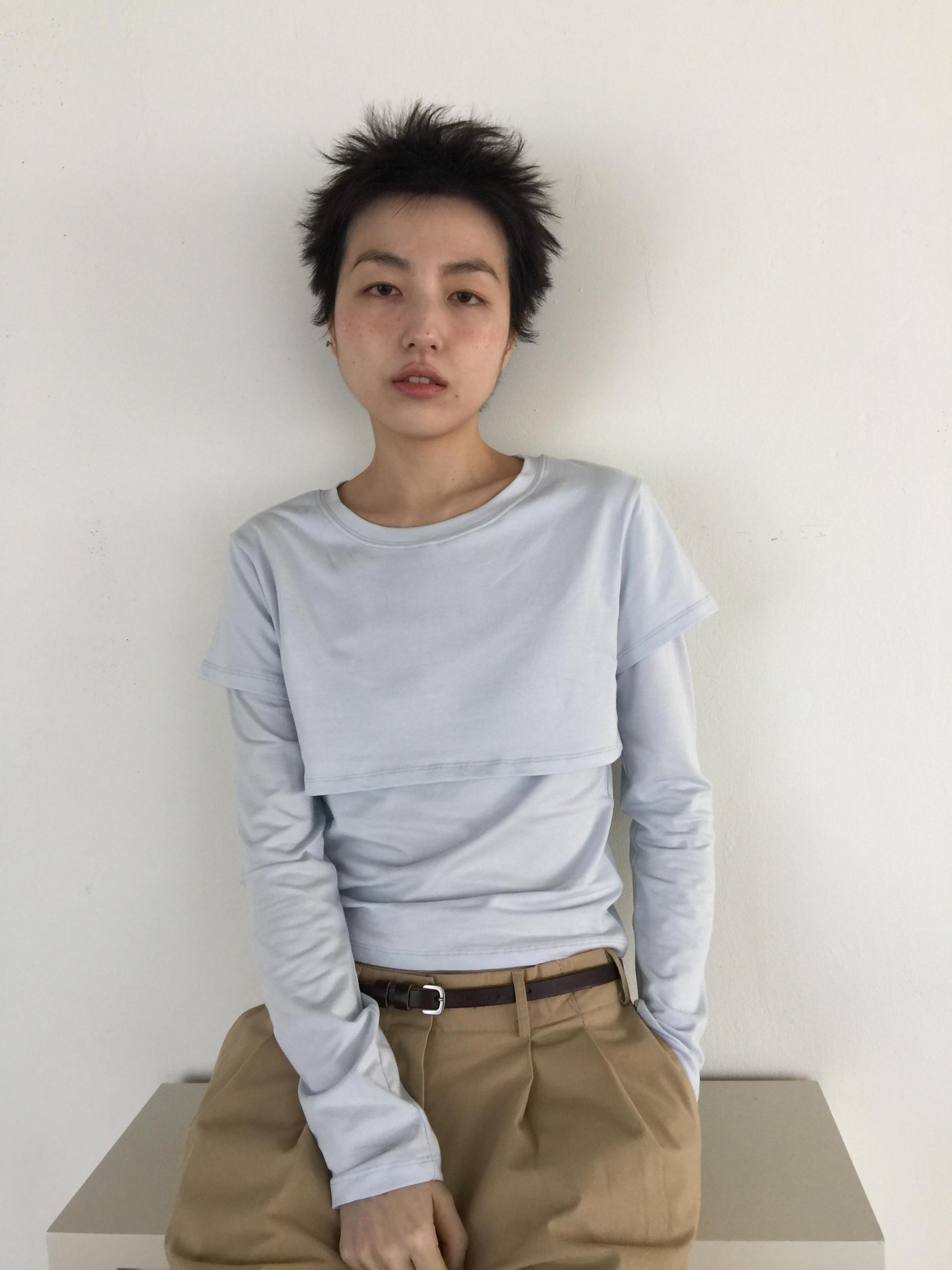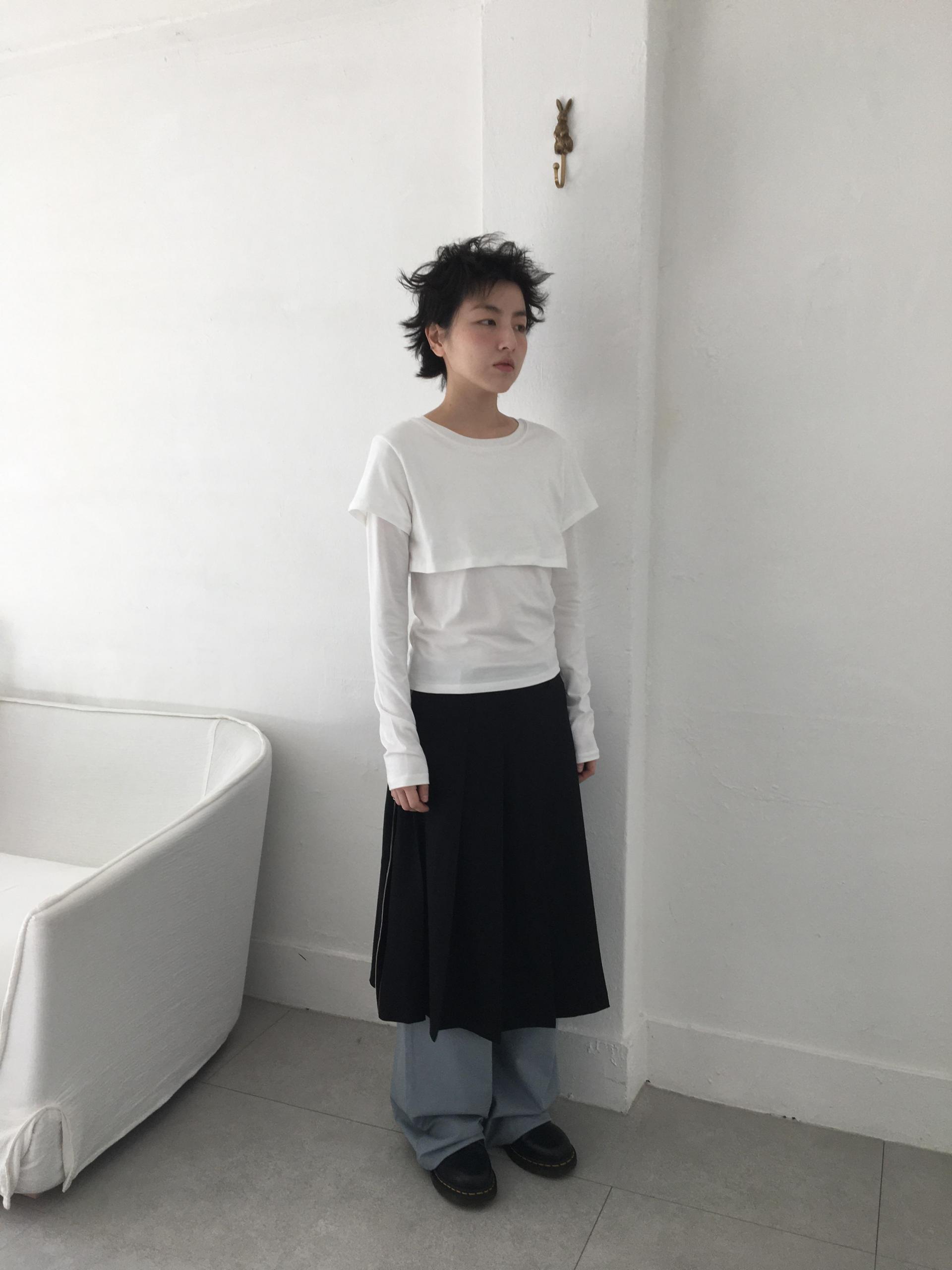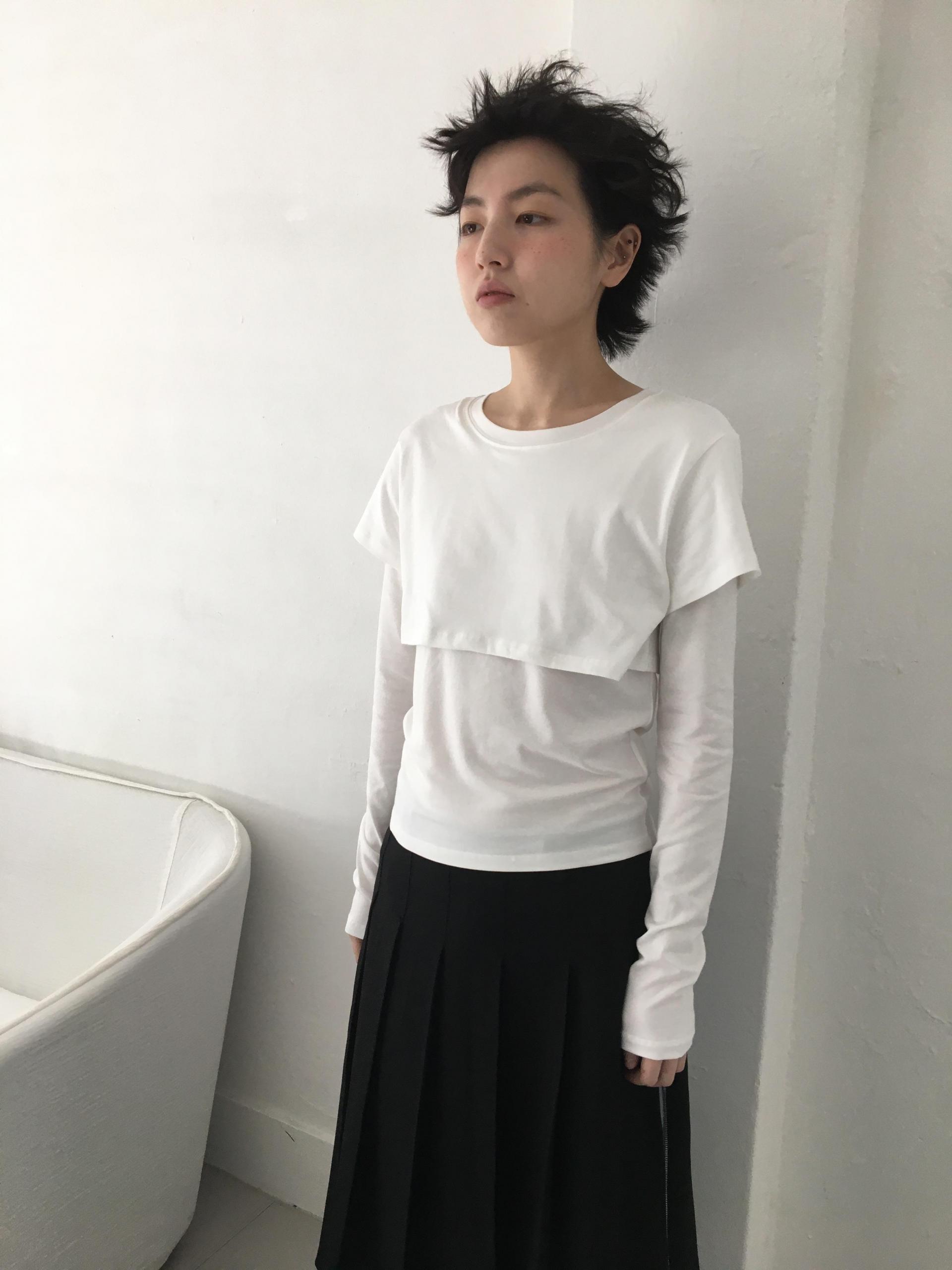 긴소매 기장과 반소매 기장이 합쳐져 레이어드한 것 처럼 연출되는 티셔츠