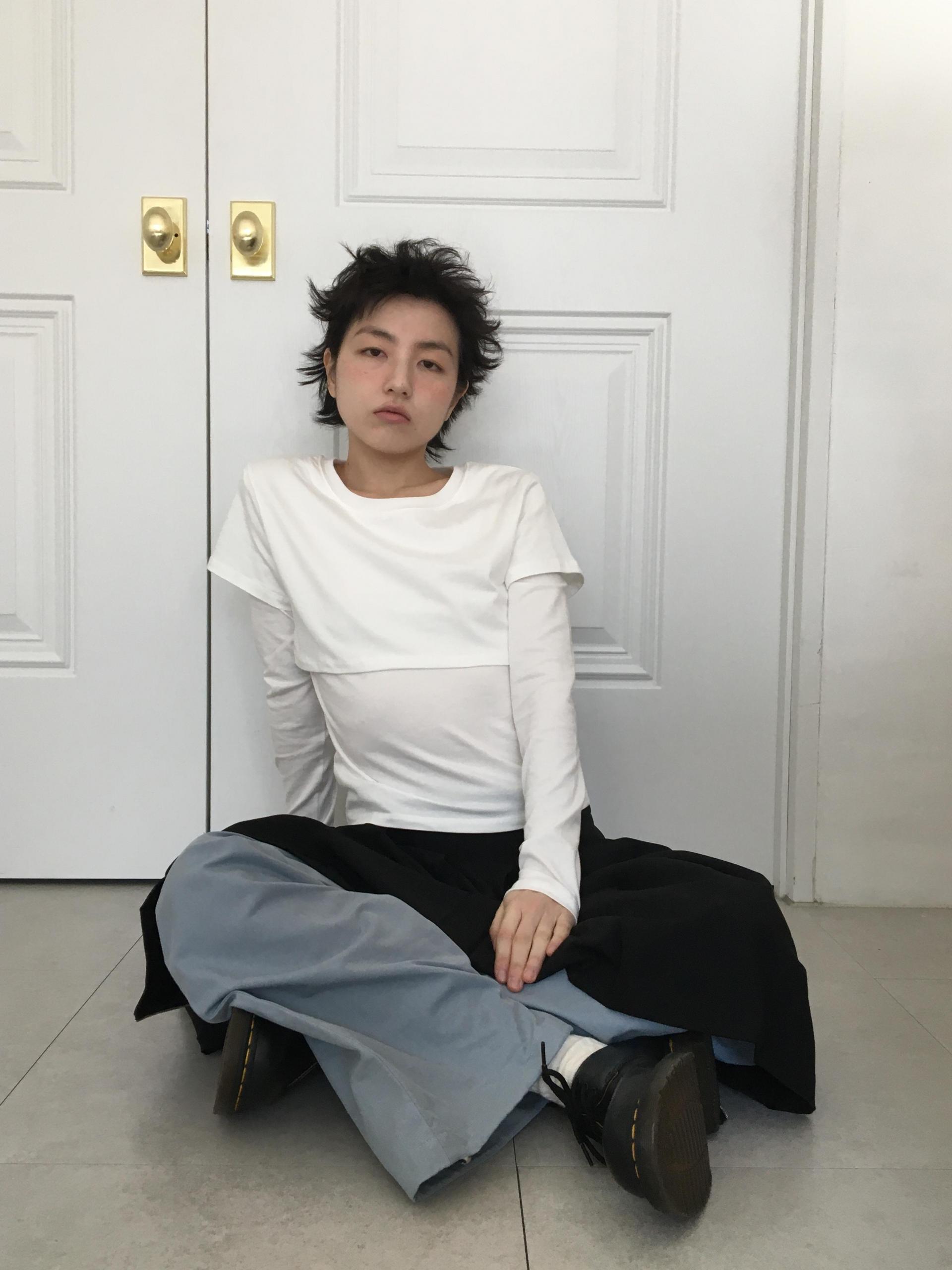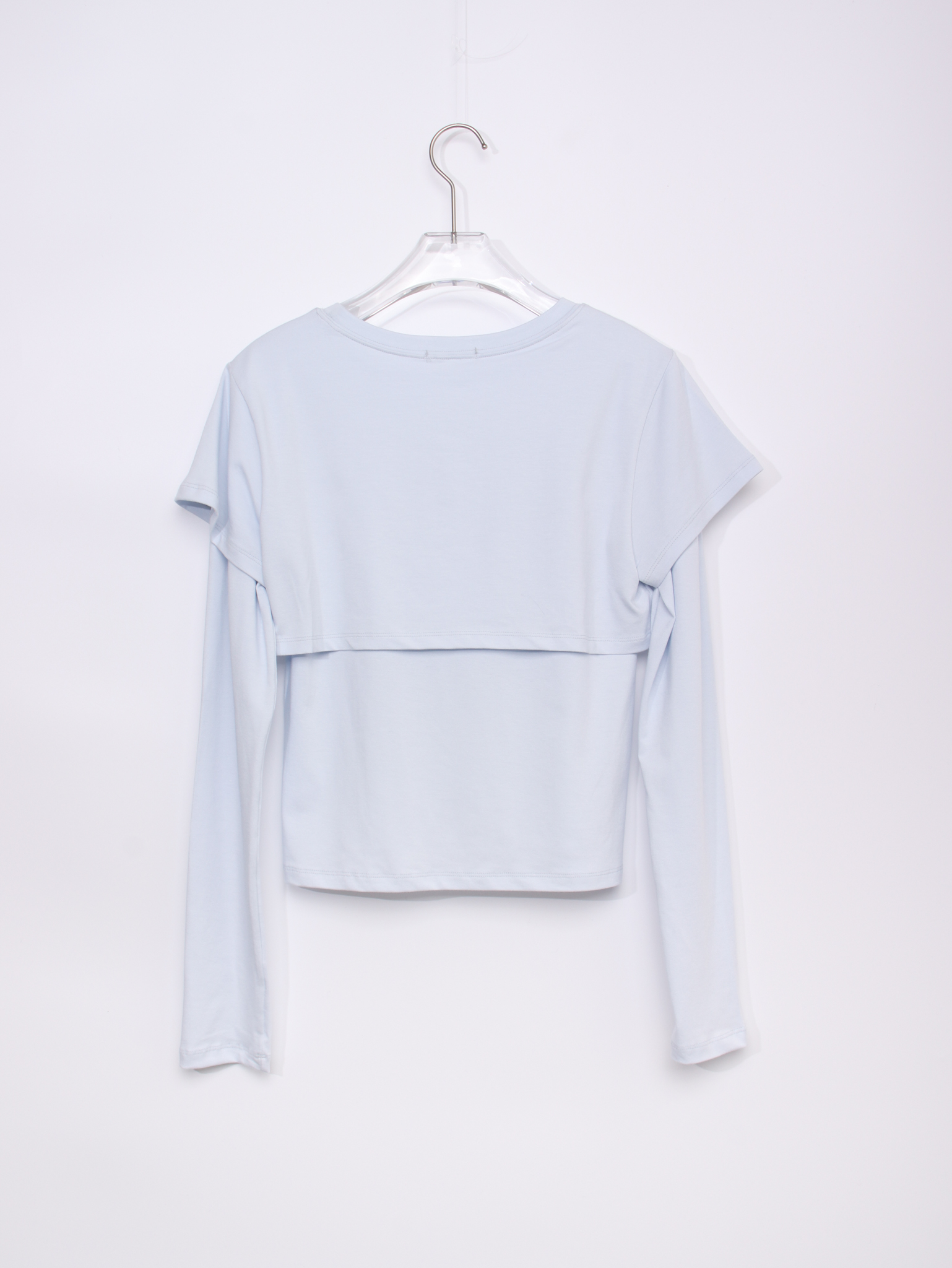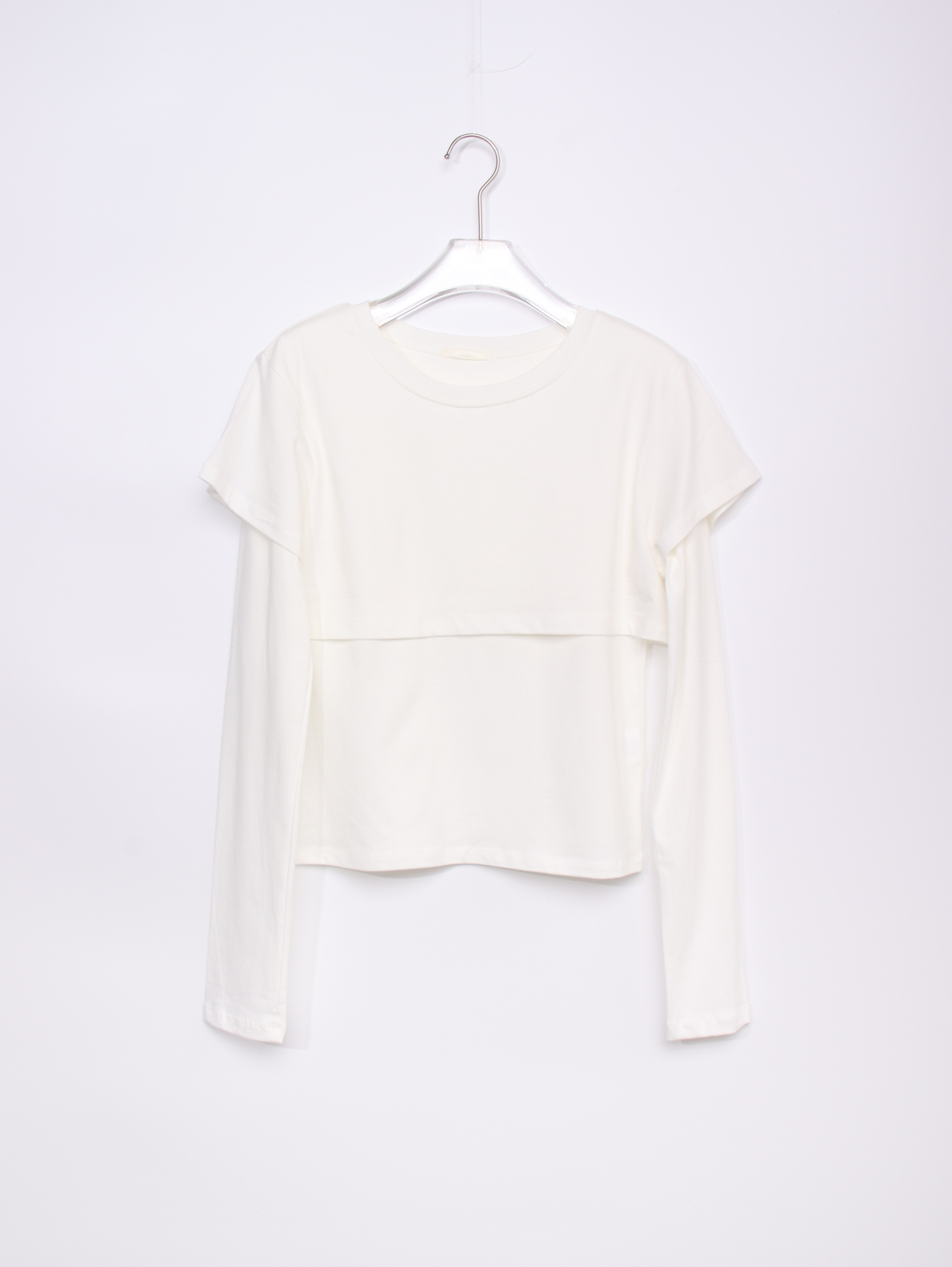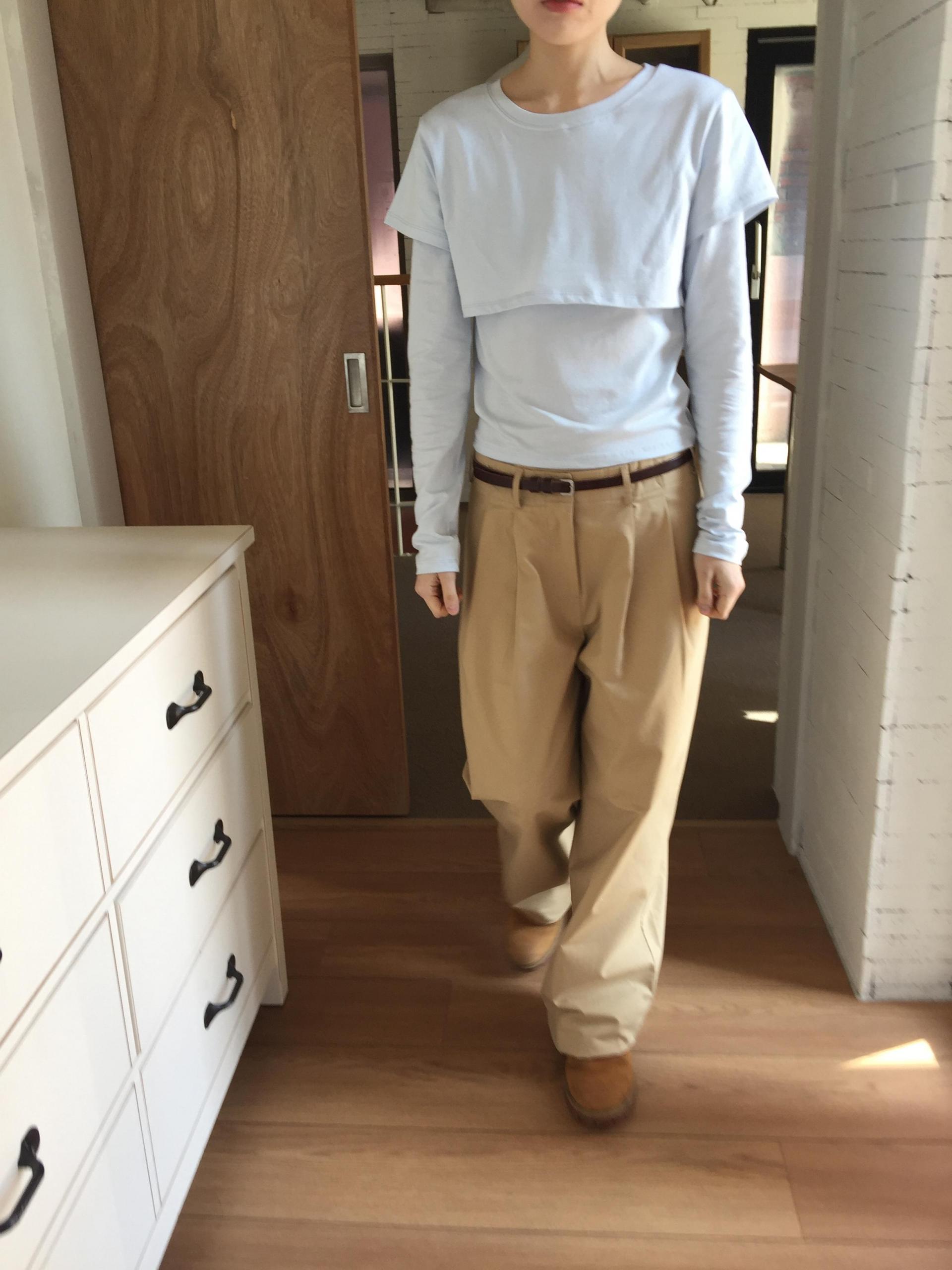 긴소매 기장과 반소매 기장이 합쳐져 레이어드한 것 처럼 연출되는 티셔츠