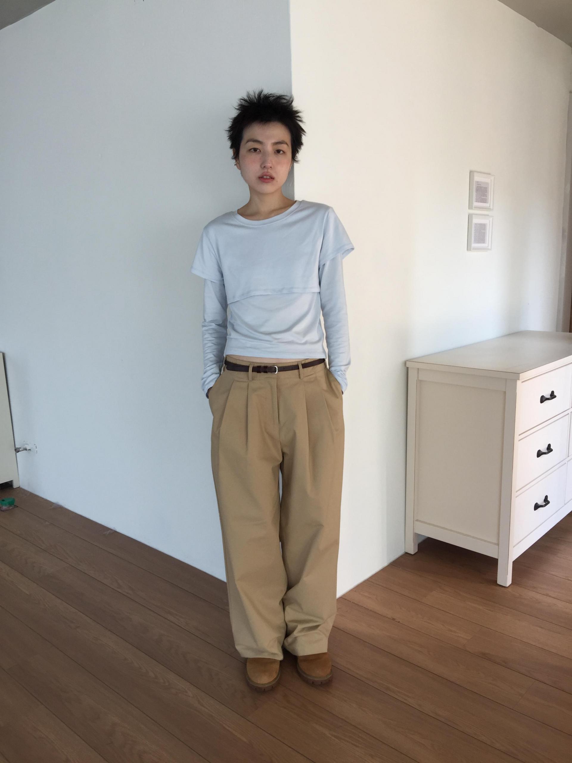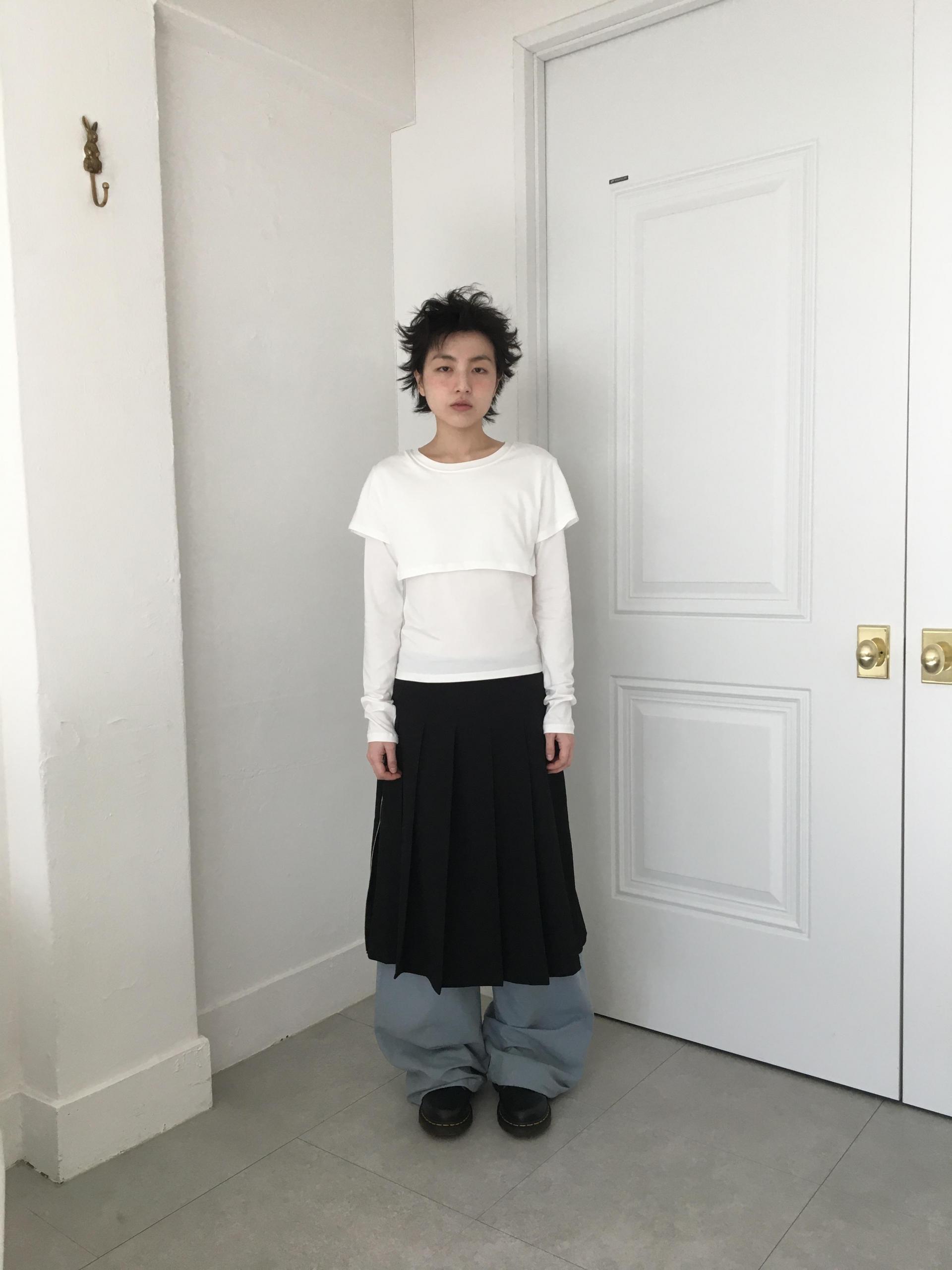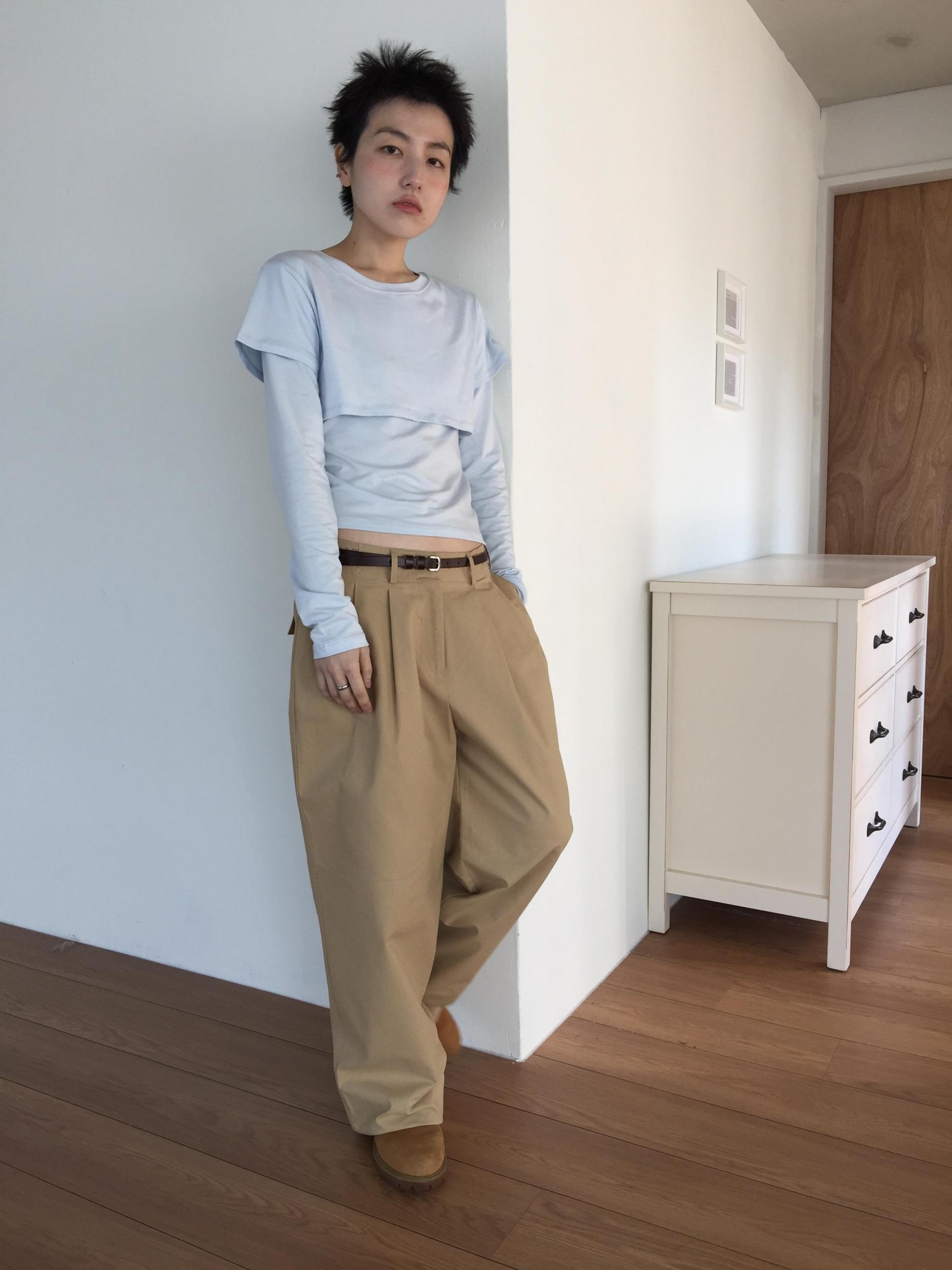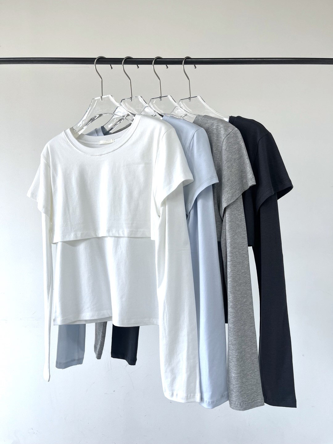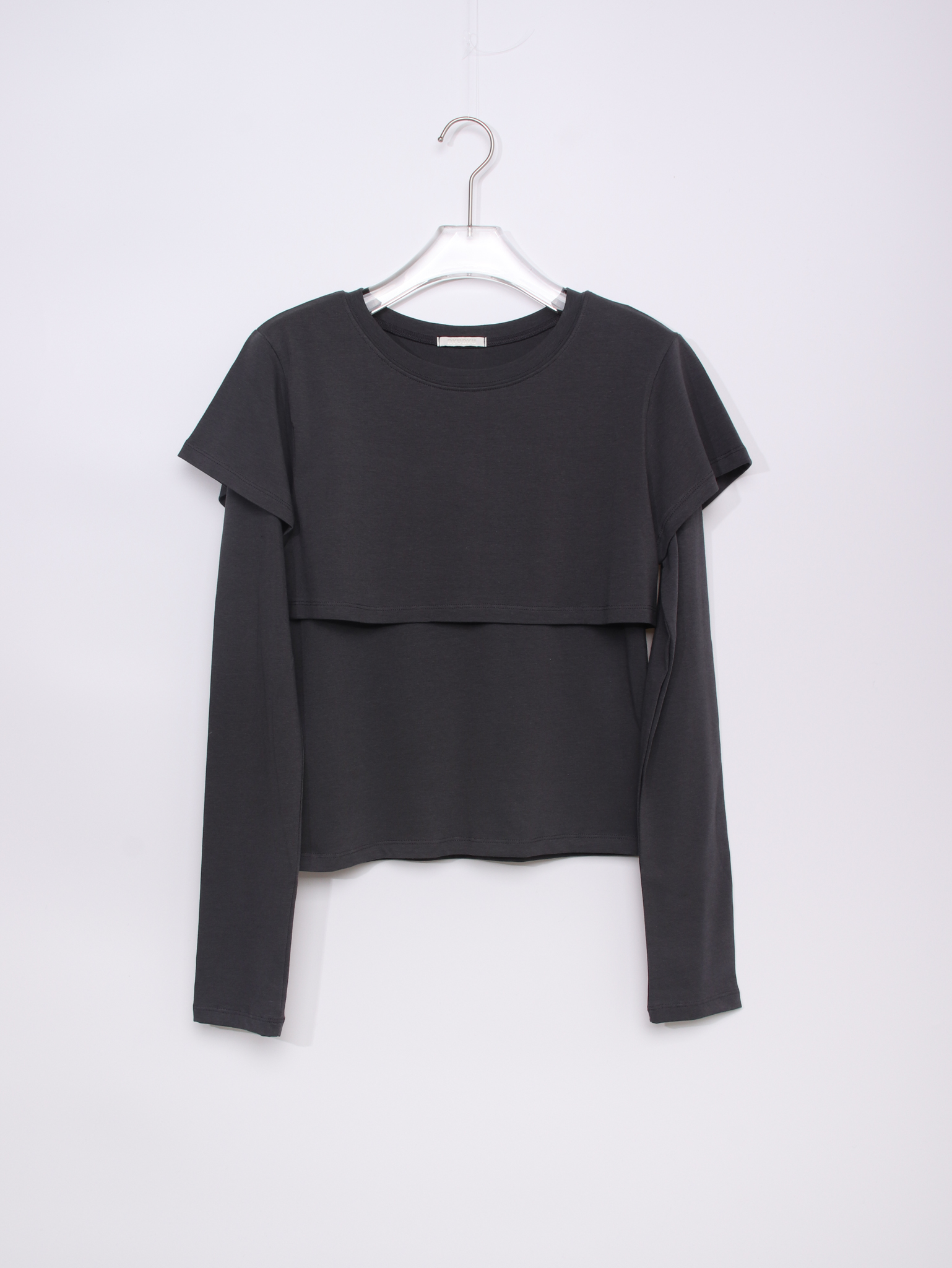 긴소매 기장과 반소매 기장이 합쳐져 레이어드한 것 처럼 연출되는 티셔츠
