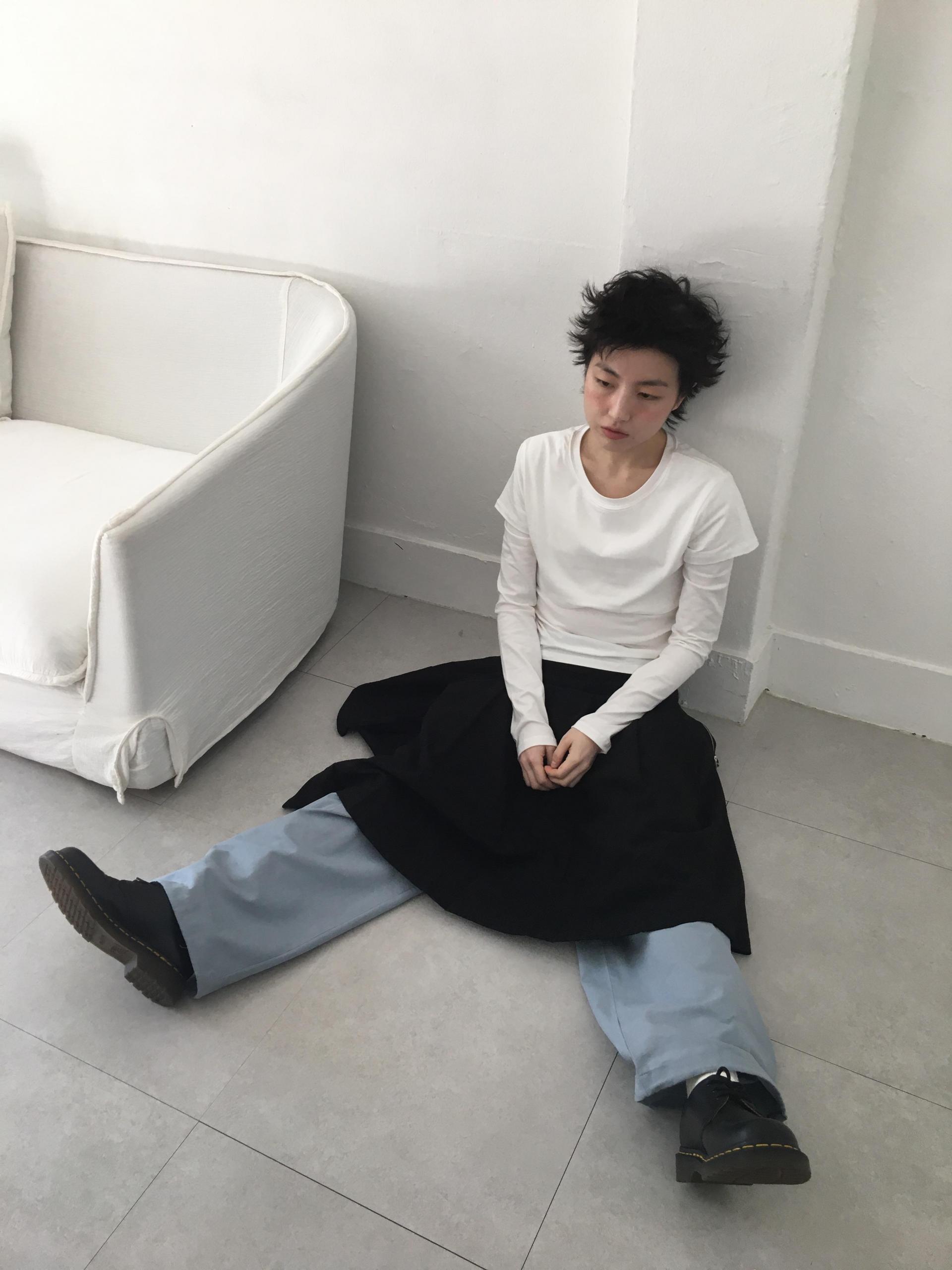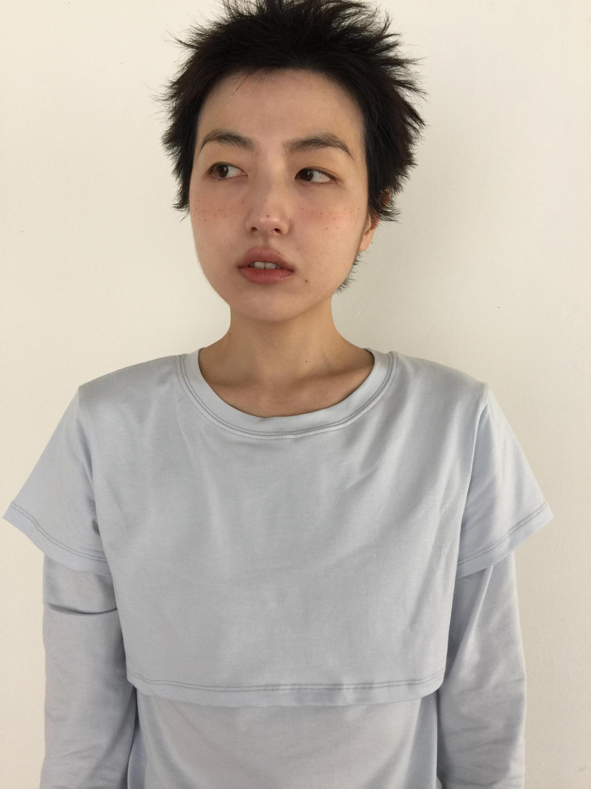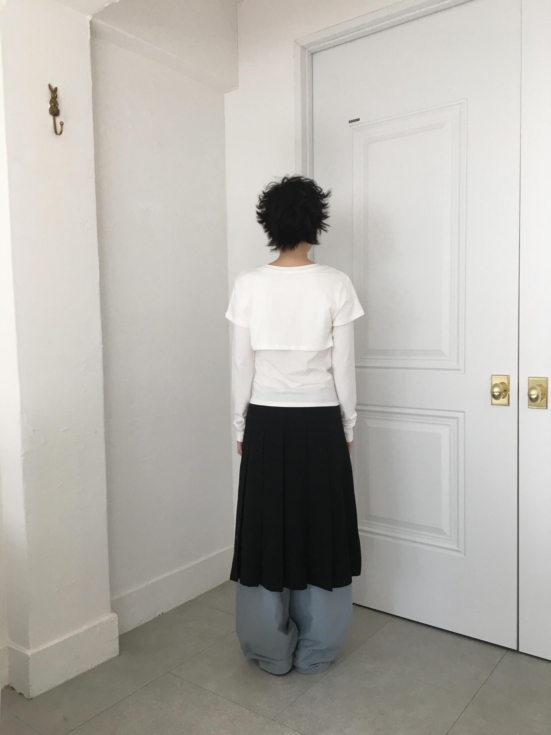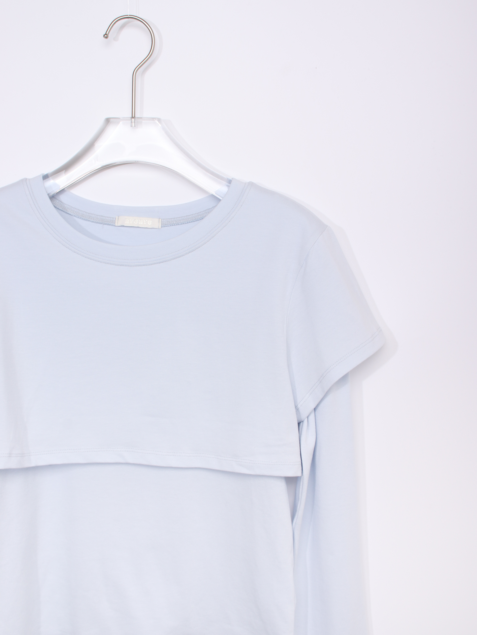 긴소매 기장과 반소매 기장이 합쳐져 레이어드한 것 처럼 연출되는 티셔츠